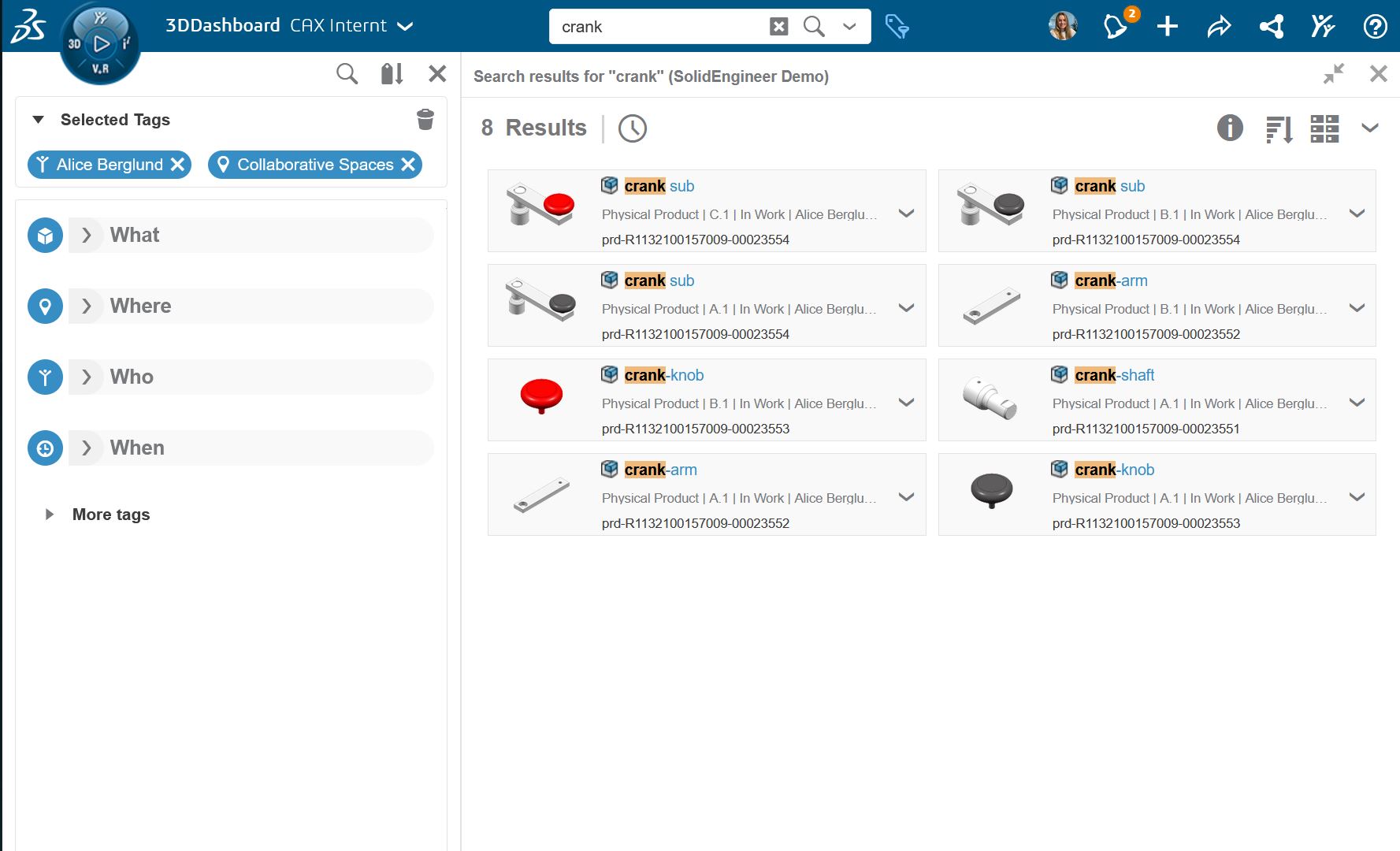 Sökfältet, som i 3DEXPERIENCE Platform kallas för 3DSearch, hittar man högst upp i mitten av Top Bar-menyn. Härifrån kan man söka bland hela sitt plattformsinnehåll eller specificera sin sökning till att enbart söka i en viss tab. För att filtrera sin sökning ännu mer så kan man ta hjälp av så kallade 6WTags. Med 6WTags kan du välja att exempelvis söka på en vis typ av fil eller på innehåll som är skapat av en viss person eller en viss dag. Man öppnar upp menyn för 6WTags genom att klicka på tag-symbolen bredvid sökrutan. Då öppnas menyn upp till vänster, där filtreringsalternativen delas upp under rubrikerna ”What”, ”Where”, ”Who”, ”When”, ”How”(!) och ”Why”.