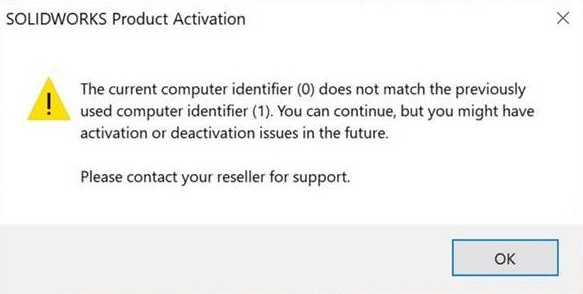 Varningen som visas är rent informativ och syftar till att varna användare om att en annan identifierare har använts för den här versionen av SOLIDWORKS. Ingen åtgärd krävs från användarna framåt. Detta meddelande kan ignoreras.