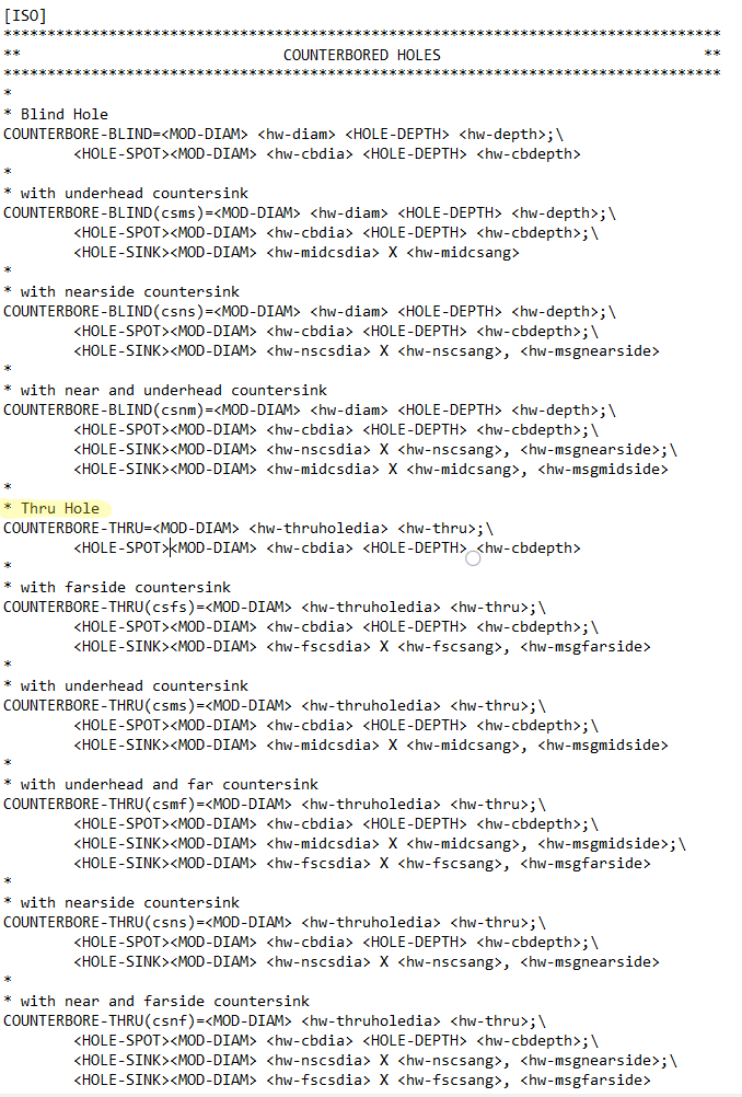 Om vi öppnar upp filen i notepad (Som administratör, då vi annars inte får editera och spara filen) så ser vi att den innehåller väldigt mycket text, vilket kan vara lite skrämmande men filen ser mer komplicerad ut än den är. Filen är uppdelad i olika standarder (ANSI, DIN, ISO etc), och under varje standard så finns alla olika håltyper. Det jag söker i detta fall är Counterbore och Countersink för ISO standarden. Efter vi har lokaliserat var dessa ligger så ser vi att det finns lite alternativ. Eftersom jag gjort ett genomgående hål så är det ”Thru-all” varianten jag måste editera.