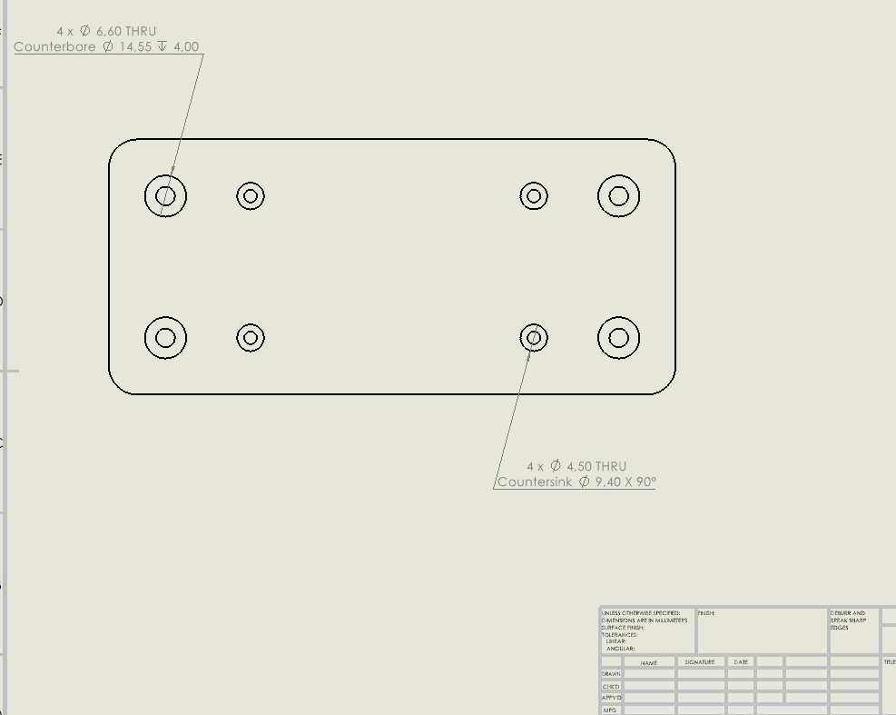Hole callout hämtar sin information från hole wizard eller från ett cirkulärt extruderat cut. Den kan innehålla en beskrivning, storlek på hålet, djup, kvantitet etc. Men varför skulle man vilja ändra på den texten? Ta exemplet nedan: Jag tycker det blir otydligt med symbolanvändningen och vill istället att det ska skrivas ut ”Counterbore” respektive ”Countersink” så det blir övertydligt vad det handlar om för hål.