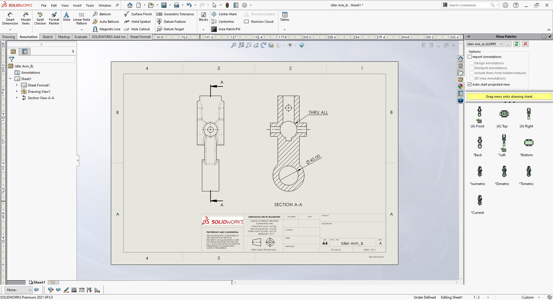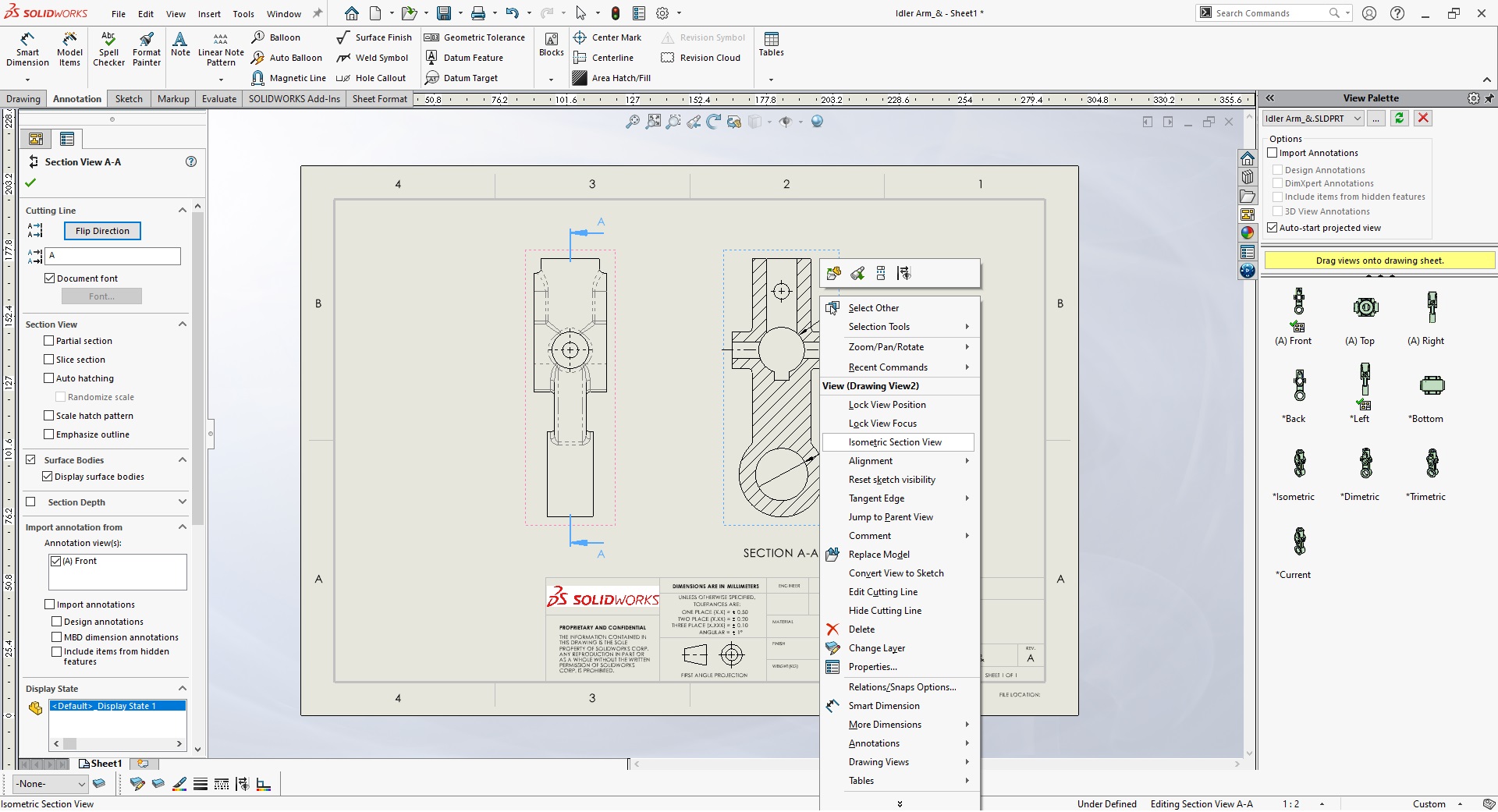 Notera att ifall du har mått utsatta i din Section View så kommer dessa att försvinna när du väljer Isometric Section View. Noteringar och andra annotations, så som exempelvis centrumlinjer, kommer däremot att finnas kvar.