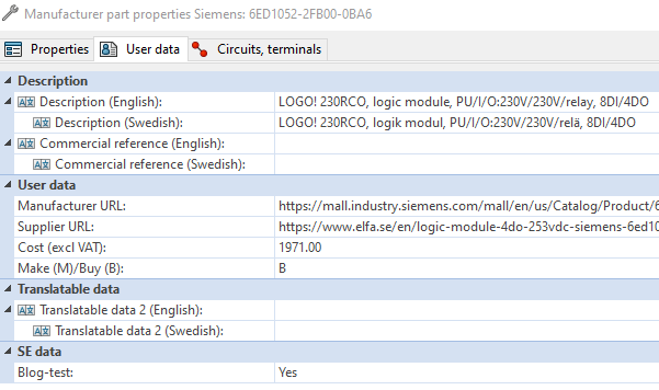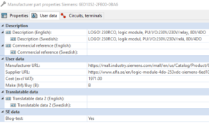 Oftast landar vi i den första fliken som möjliggör en mängd meta-data (egenskaper för artikeln). Har vi en 3D-part representation så finns filutpekningen på första fliken, vi kanske vill specificera in märkström, artikelnummer från tillverkaren, leverantören och företagsinternt etc. Något lämpligt fält för pris och URL hittar vi dock inte annat än att gå till flik två ”User data” . Här har vi en rubrik som lyder ”User data”, vi verkar vara på rätt väg…