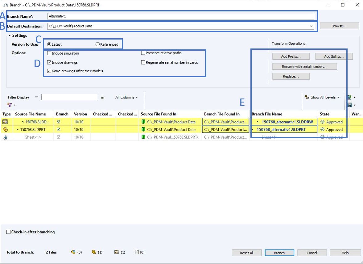 i SOLIDWORKS PDM Professional finns möjligheten att arbeta parallellt med olika designalternativ för att sedan när det är bestämt vilken av alternativen man vill behålla, flytta tillbaka designen till den ursprungliga filen.