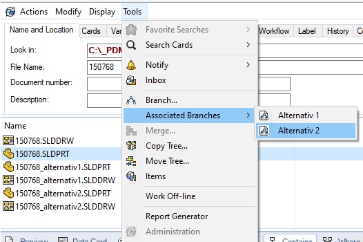 Om man ställer sig på ursprungsfilen 150768.sldprt och väljer Associated Branches, så går det att se de Branches vi skapat, och i nästa fönster vilka filer som tillhör dessa alternativ.