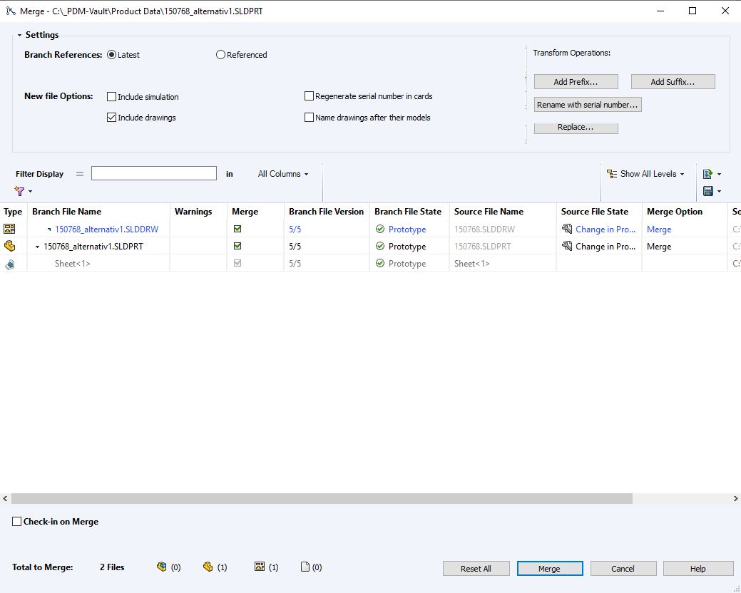 Markera då 150768_alternativ1.sldprt och välj Merge i menyn.