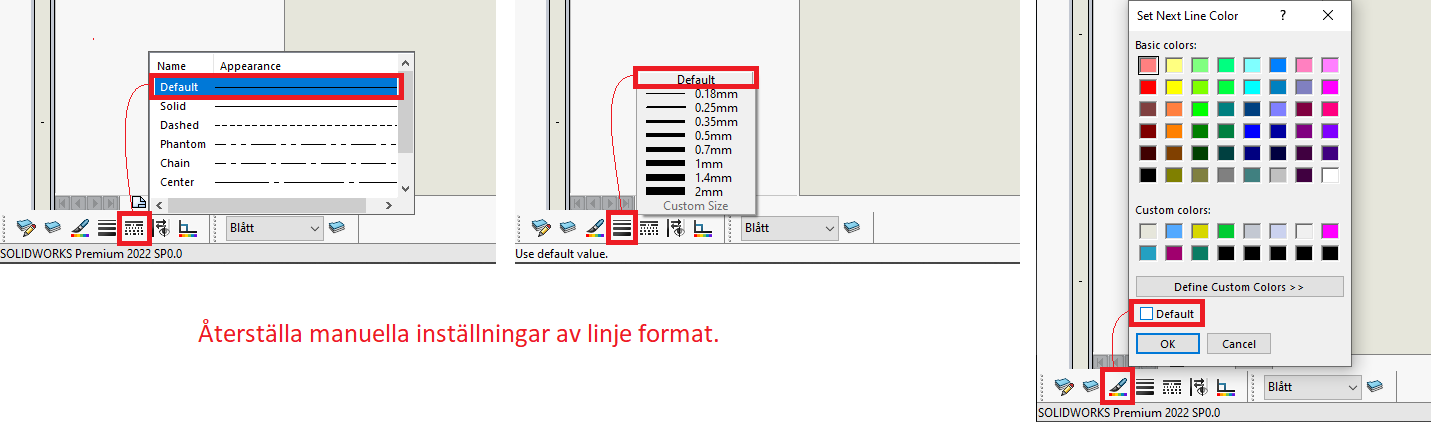 De tre linjeinställningarna kan användas utan lager och överskrider då lagerinställningar och kan bara redigeras manuellt. Det enda sättet att återgå till lager inställningen är genom att att välja Default i dess inställning.