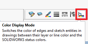 I Line Format finns också en knapp som heter ”Color Display Mode”. Med den växlar användaren mellan att visa lager och manuellt valda färger. Med ”Color Display Mode” nedtryckt visas SOLIDWORKS standardfärger (till exempel Defined, Undefined eller Dangling). För att kunna se lager ska knappen inte vara nedtryckt.