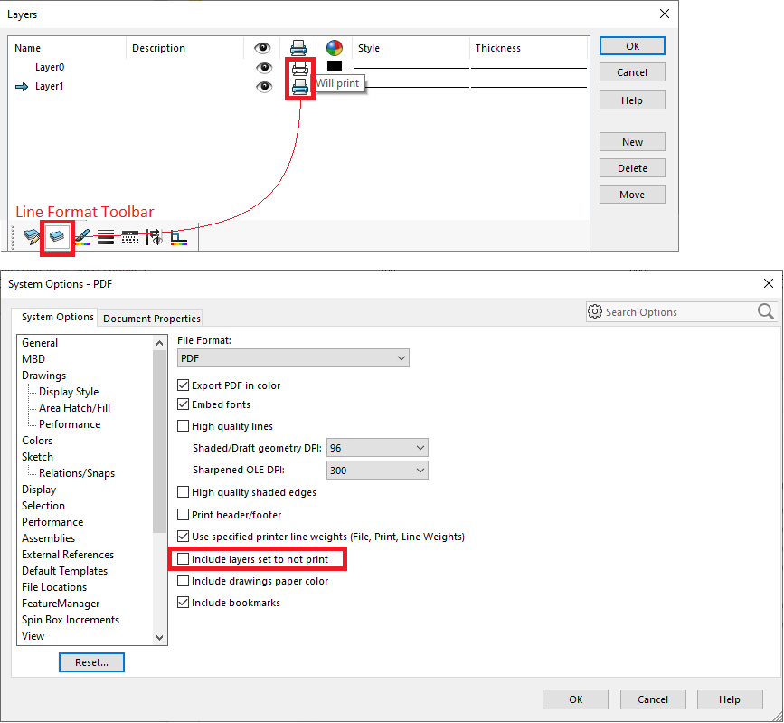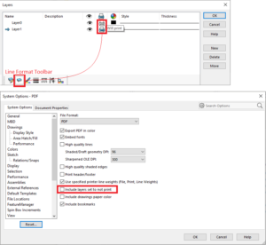 För att välja att dölja lager till PDF och utskrift ändra inställningen för Layers och klicka på ”Will print”.