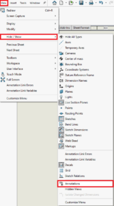 tt dölja innehåll på ritningen genom att färga det med samma färg som bakrunden är fel metod. Använd ”Hide”-funktionen istället, det finns ett verktyg för att dölja/visa genom att starta View > Hide/Show > ”Annotations” (längst ner).