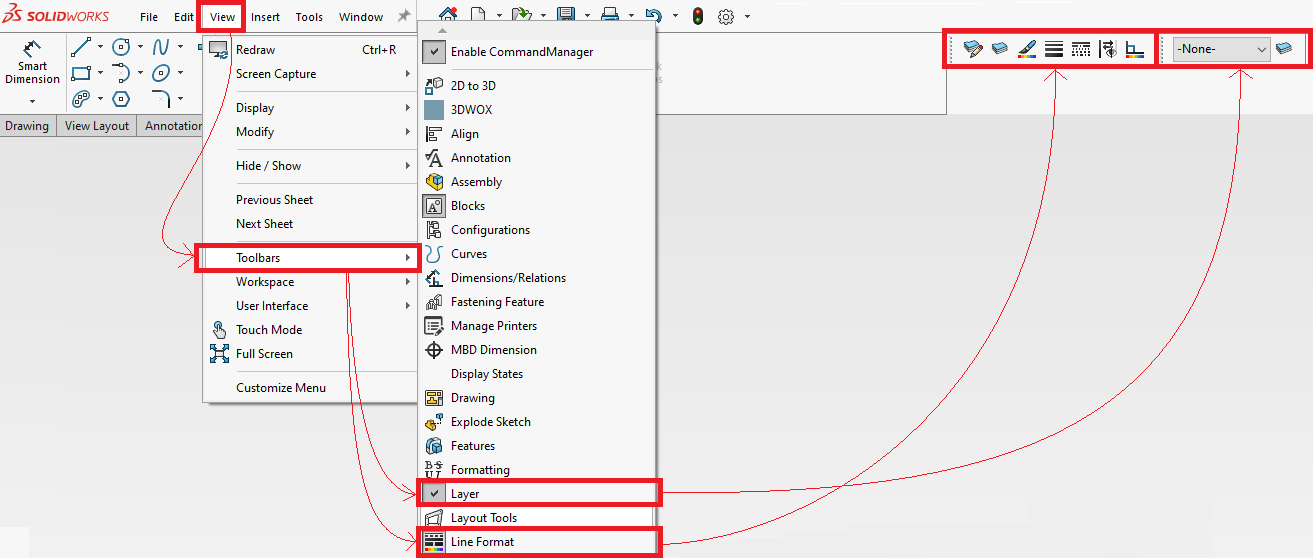 - Med SOLIDWORKS följer tre grunläggande lager:”-Per Standard-” som innebär den uppsättning med lager som finns inställda i Options > Document Properties. Inställningarna finns lagrade i ritstandarden (Drafting Standard), tex ISO, ANSI eller en egenanpassad standard). Det går också att spara Ritstandarden med Document Properties i mallarna för Drawing Template (*.drwdot) och Sheet Format (*.slddrt).