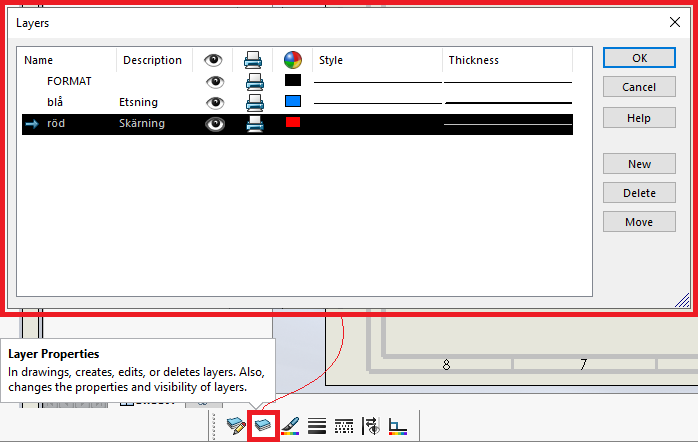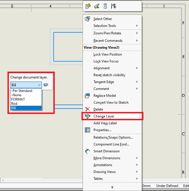 - Lagret ”FORMAT” är ett lager med standardinställningen i SOLIDWORKS, dvs. svart färg, heldragen linje och 0,18 mm linjetjocklek.