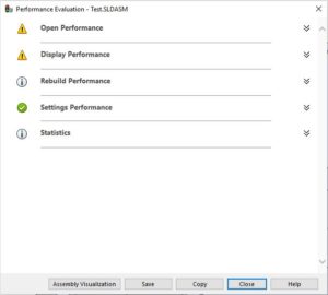 Performance Evaluation kan vara en bra funktion att använda om programmet laddar segt vid öppning av del, sammanställning och ritning. Performance Evaluation analyserar öppnings- och återskapandetiden och vilka element som påverkar prestandan.