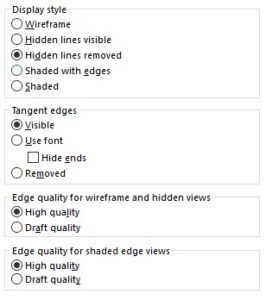 Display Style kan man kolla igenom. Draft Quality istället för High Quality kan förbättra prestandan på ritningar. Om man har en stor sammanställning så ska man kanske använda sig av Shaded istället för Shaded with Edges då det kräver mycket av datorn att generera kanter.