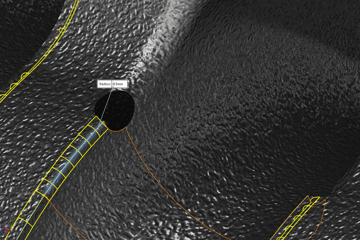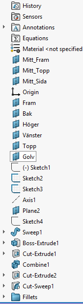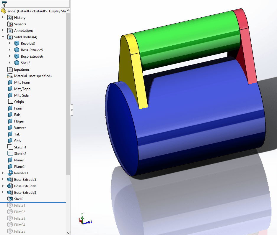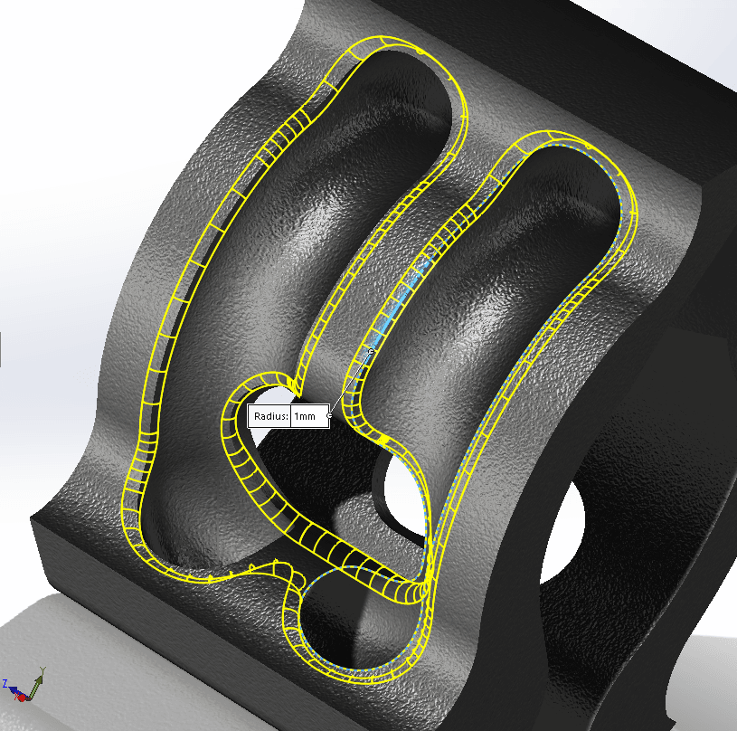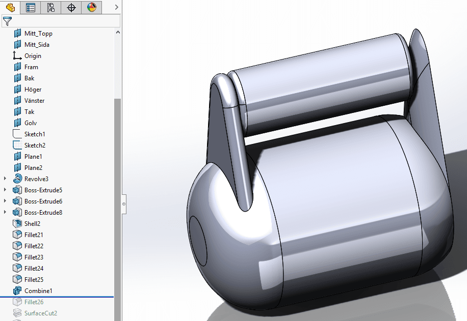 Om SOLIDWORKS har svårt med en avrundning, leta efter områden där avrundningen är så stor att en yta helt och hållet försvinner. Vidta någon åtgärd. Man kan tänka sig en variabel fillet eller