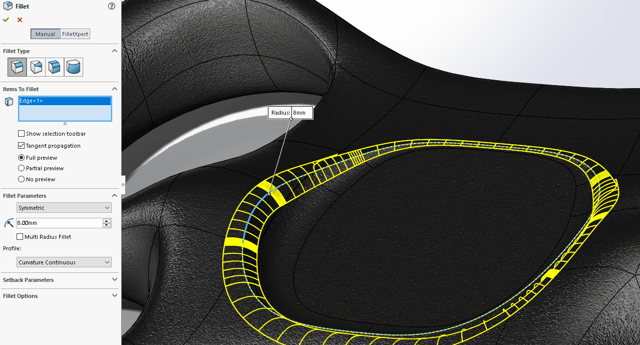 SOLIDWORKS föreslår alltid en radie innan ni börjat välja kanter. Byt radie till något som ni tror fungerar innan ni börjar välja kanter så slipper ni vänta på att SOLIDWORKS