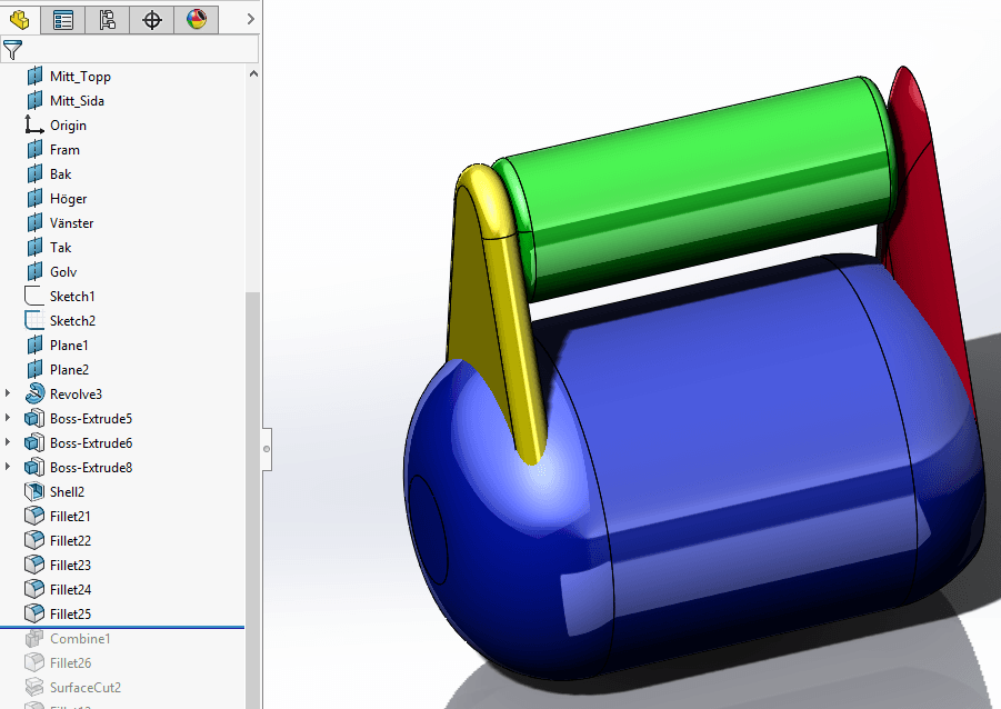 Om SOLIDWORKS har svårt med en avrundning, leta efter områden där avrundningen är så stor att en yta helt och hållet försvinner. Vidta någon åtgärd. Man kan tänka sig en variabel fillet eller