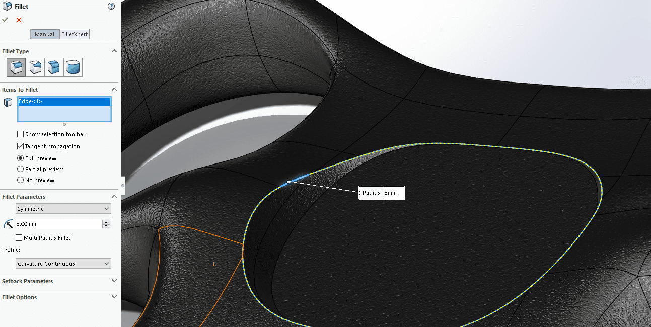 SOLIDWORKS föreslår alltid en radie innan ni börjat välja kanter. Byt radie till något som ni tror fungerar innan ni börjar välja kanter så slipper ni vänta på att SOLIDWORKS