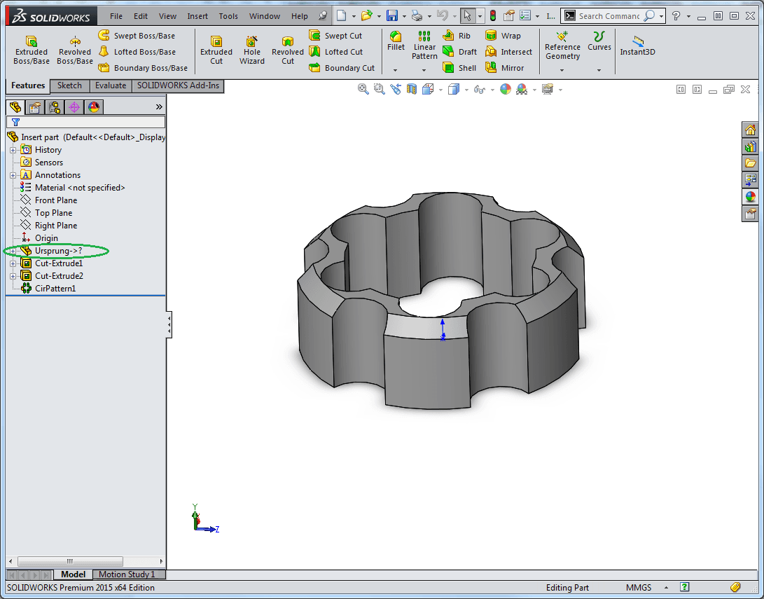 - När parten är uppe på skärmen ser det inte som att något hänt. Det sista vi behöver göra för att förändringen skall slå igenom är att välja edit feature på den instoppade parten i historieträdet. När kommandot dyker upp trycker du bara Ok. Nu skall den instoppade parten vara utbytt.