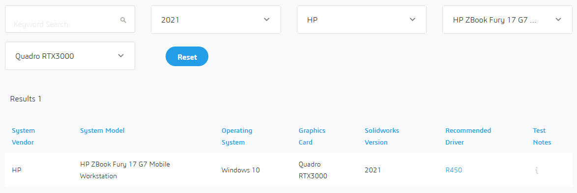 Där kan man kontrollera att den dator man funderat på är testad av SOLIDWORKS och att det finns en certifierad grafikkortsdrivrutin för den release av SOLIDWORKS som ska användas. Ett exempel ser ni i bilden.