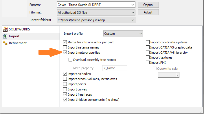 När vi öppnar en SOLIDWORKS-fil i Composer så finns ju ett antal import-inställningar där vi väljer vad vi vill ta med in i vårt Composerdokument. Ett av dessa alternativ är ”Import meta-properties”.