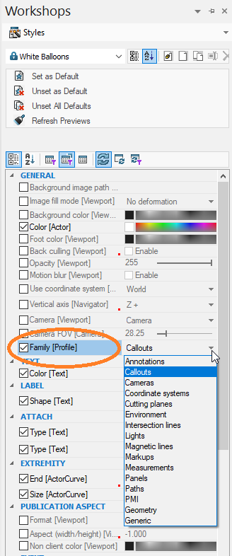 Du kan välja ifall en Style ska gå att applicera på alla typer av Collaborative Actors eller om den ska tillhöra en Familj av actors (kan endast väljas via workshop-inställningarna). Sätter Du egenskapen Family (Profile) till Generic så kan din Style appliceras på alla typer av Collaborative Actors. Annars gäller den för den specifika familj du har valt.