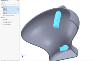 Så jag tänkte kolla på några scenarier när den är väldigt smidig att använda. Den första skulle jag säga är den mest använda. Ta bort ett eller flera hål i en stepfil. När man får in en stepfil så ska man kanske bearbeta den på något visst sätt fräsning, skärning gjutning etc. Då kan det ofta vara ställen som man behöver efterbearbeta som till exempel hål och dessa vill då bli av med i modellen. Nedan ser vi ett exempel på detta.