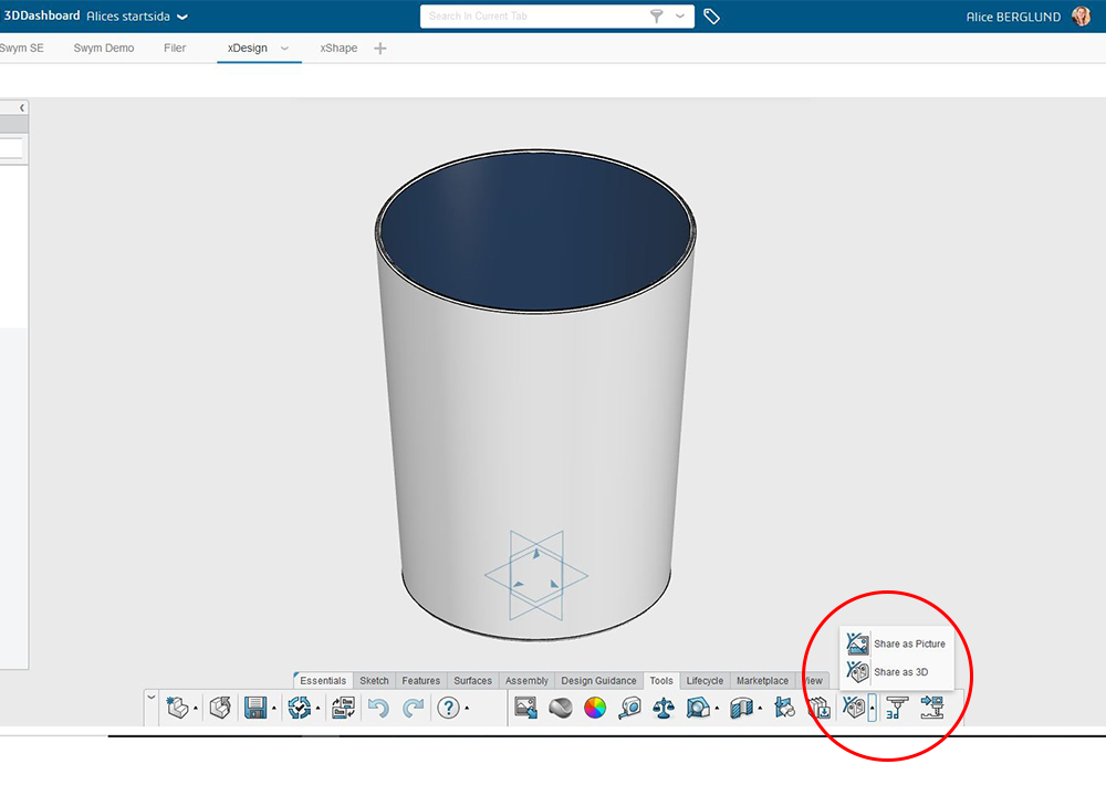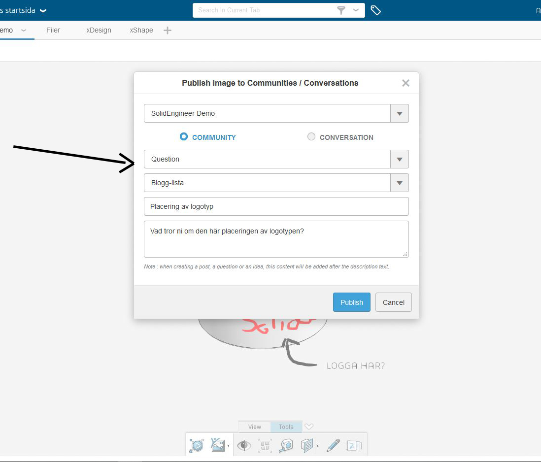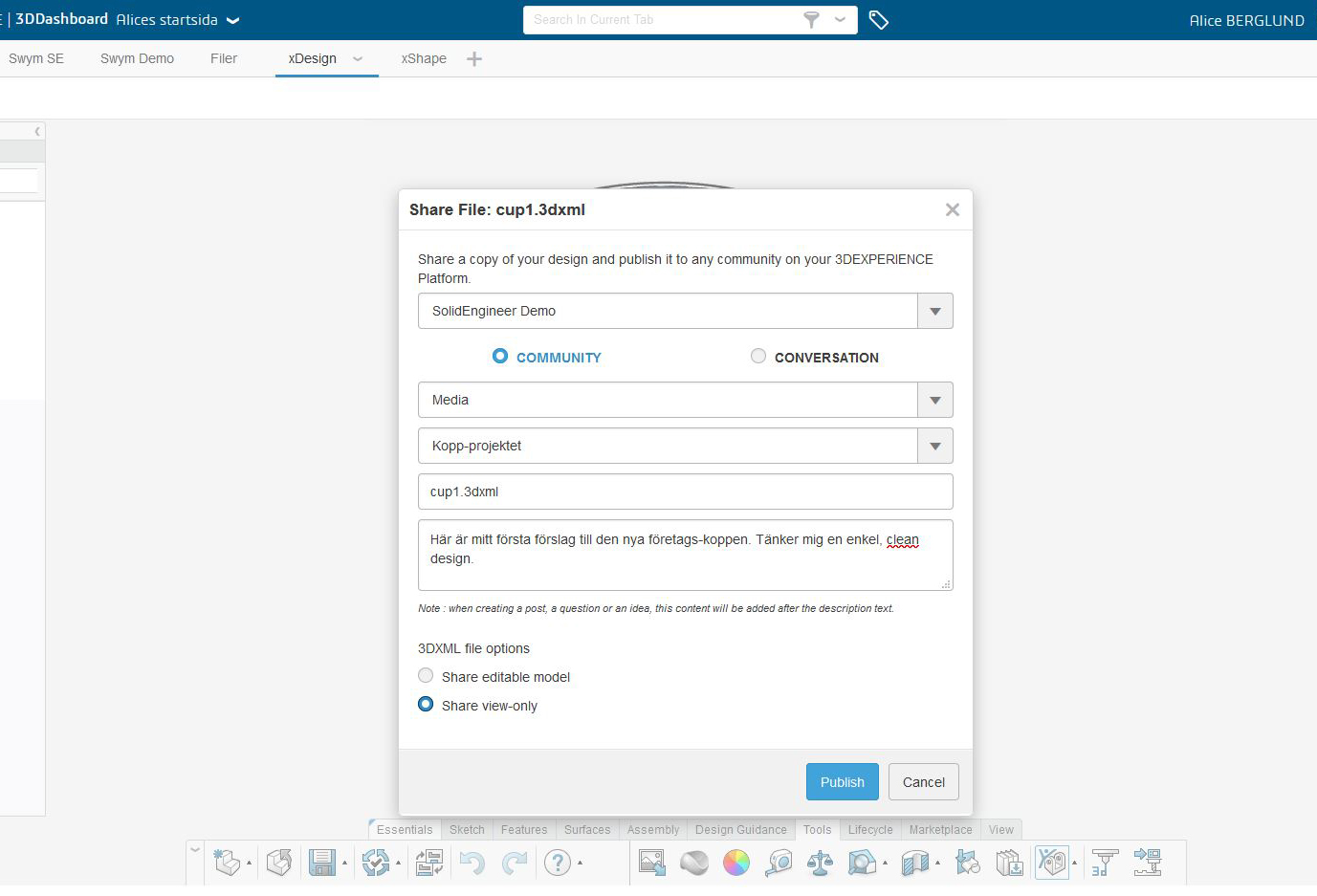 Med min kopp-modell öppen i xDesign kan jag därifrån direkt lägga upp den som ett inlägg i arbetsgruppens egna Community i 3DSwym. Under fliken Tools i den så kallade aktionmenyn, som löper längs nedre sidan av appen, hittar man publiceringsverktyget. Här kan man välja att lägga upp en 2D- eller 3D-vy av sin modell direkt i ett Community. Jag väljer i det här fallet Share as a 3D och fyller sedan i vilket Community jag vill publicera vyn.