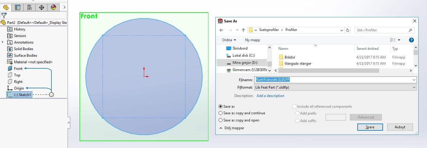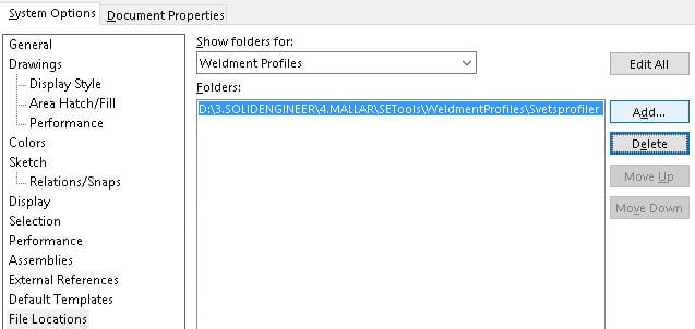 - Spara filen i ett bibliotek som ni antingen redan pekar på via File location i Tools Options File location, eller har för avsikt att utnämna till er nya balkmapp och peka sedan ut den med Tools options – System Options – File Location – Weldment Profiles.