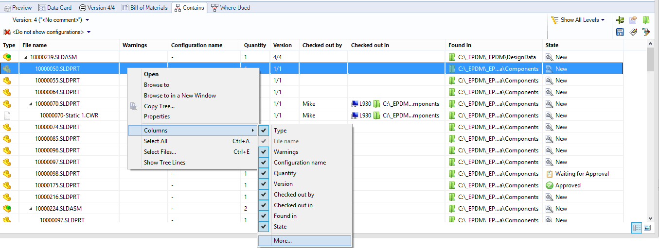 I SOLIDWORKS Enterprise PDM använder man ofta flikarna ”Contains” och ”Where Used” för att se vad saker består av och var de ingår. Men till skillnad från BOM-fliken så är kolumnerna inte kontrollerade av en central inställning som administratören ställt in.