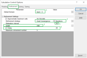 Vi börjar med att ställa in hur i hur många steg programmet ska få förfina meshen (1). Refinement Strategy (2) ger oss möjlighet att ställa vad programmet ska ”hålla koll” på. Här väljer vi Goal Convergance och väljer All Goals (3) för att då programmet att säkerställa konvergens för alla Goals. Med funktionen Delay kan vi sätta en fördröjning på ett antal iterationer för att säkerställa att resultaten har en stabil konvergens innan cellnätet förfinas. Vi kan också ange ett Relaxation Interval för antal iterationer innan körningen anses vara färdig (5). I fliken Finishing kan vi också säkerställa att vi verkligen går igenom alla förfiningar innan körningen är klar.