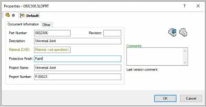Bilden ovan är ett ganska enkelt datakort där vi kan fylla i information. För till exempel Part Number så har vi gjort en nummersnurra som genererar ett nytt nummer varje gång man sparar en ny del. Material är också något som datakortet tar från det satta materialet på parten. Revisionen kommer att stämplas när vi skickar parten till Released, då stämplas Revision med ”01” eller ”A”, beroende på vad man vill ha för revisionssnurra.