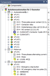 Komponentfliken visar strukturen (hierarkin) av ingående komponenter. Exempelvis ”I vilket skåp sitter kontaktor K1 placerad och med vilka schematiska symboler är K1 representerad ?”