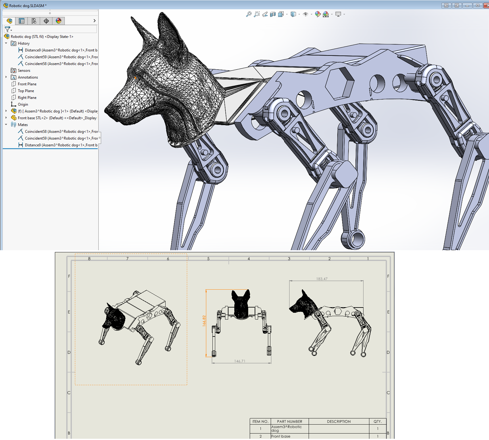 1. I det här exemplet används en robotkropp ritad i SOLIDWORKS som ska kopplas ihop med ett 3D-skannat hundhuvud från en STL-fil.