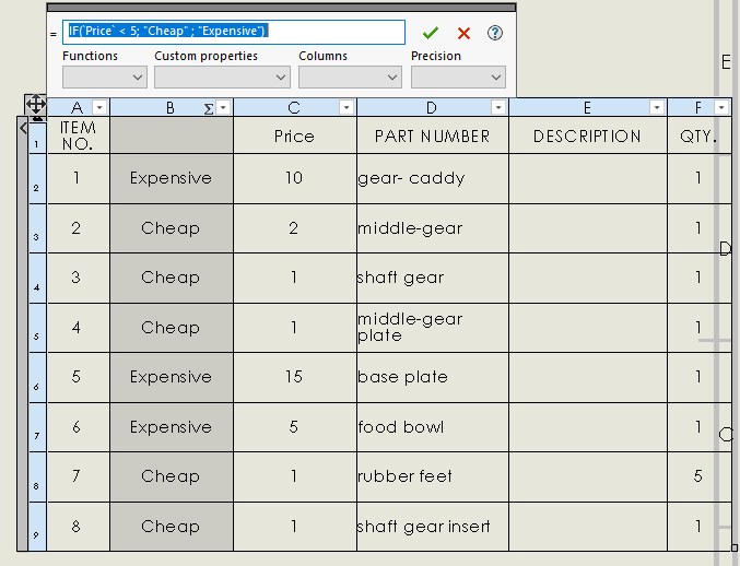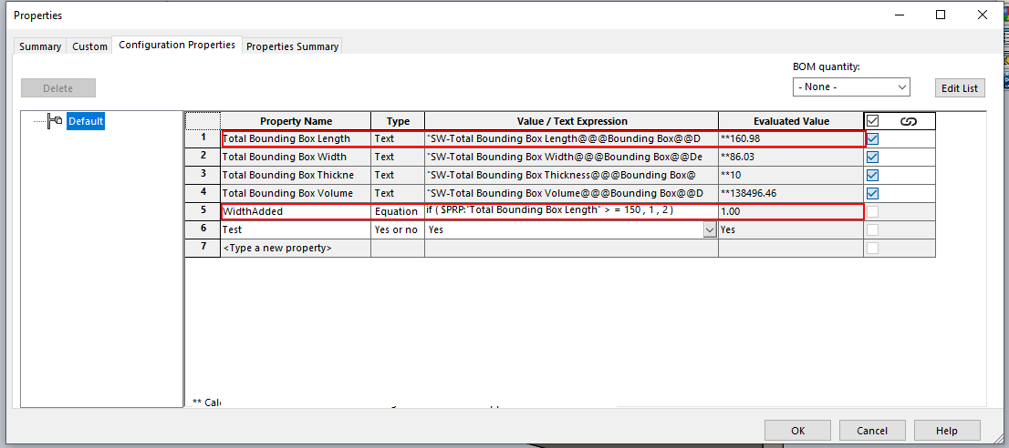 Viktigt att veta här att om man till exempel vill använda sig av en property som en del av villkoret eller värdet som ska skrivas ut anges dessa properties inom apostroftecken (”). Om man istället vill använda sig av kolumner i den befintliga BOMen så anges kolumnnamnet inom citattecken (’’).