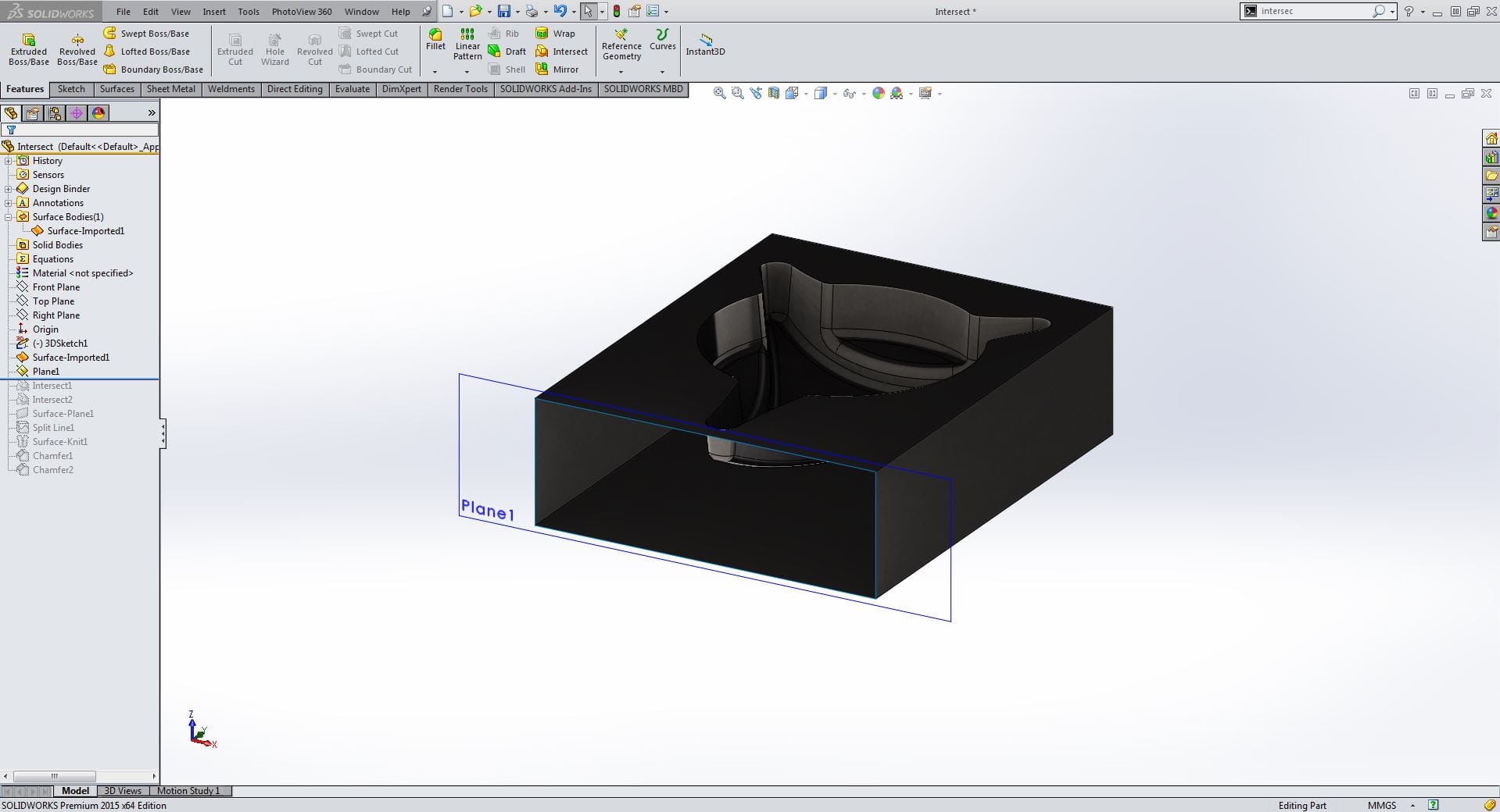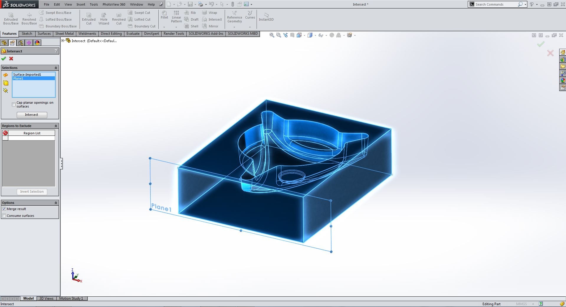 Intersect gör det möjligt att skapa en solid geometri från ett slutet hålrum. Hålrummet kan avgränsas med plan eller ytor med varierande form. Du kan också slå ihop solider med hjälp av verktyget.
