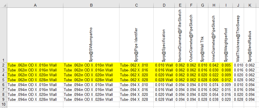 I första kolumnen bestäms namnet på konfigurationen och i efterföljande de properties (egenskaper) och mått som styr geometrin för just den konfigurationen. Ändra INTE i rubrikerna (rad 1). Skrollar man ner så ser man att denna part-fil har 377st konfigurationer. Jag bestämmer mig för att min tube-PEM.sldprt får nöja sig med 8st dimensioner (konfigurationer). Således tar jag bort raderna 10-378 !