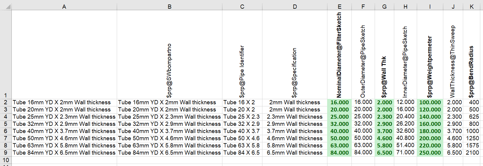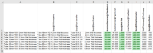 Skulle jag nu stänga excel-filen så tar SOLIDWORKS bort de 369st konfigurationerna och 8st blir kvar. Vi gör dock några fler ändringar innan vi stänger. Eftersom vi bytte enhet till millimeter så behöver vi ha våra siffror i mm. Se bild nedan gällande lämpliga värden för diametrar, godstjocklek, vikt, böjradier. Justera också namnen så att de stämmer med värdena. Hur du gör detta är upp till dina excel-kunskaper. Jag har valt att använda text-formler så att jag bara behöver justera i de gröna fälten så fylls resten i automatiskt. Gör detta på ett sätt du finner lämpligt.