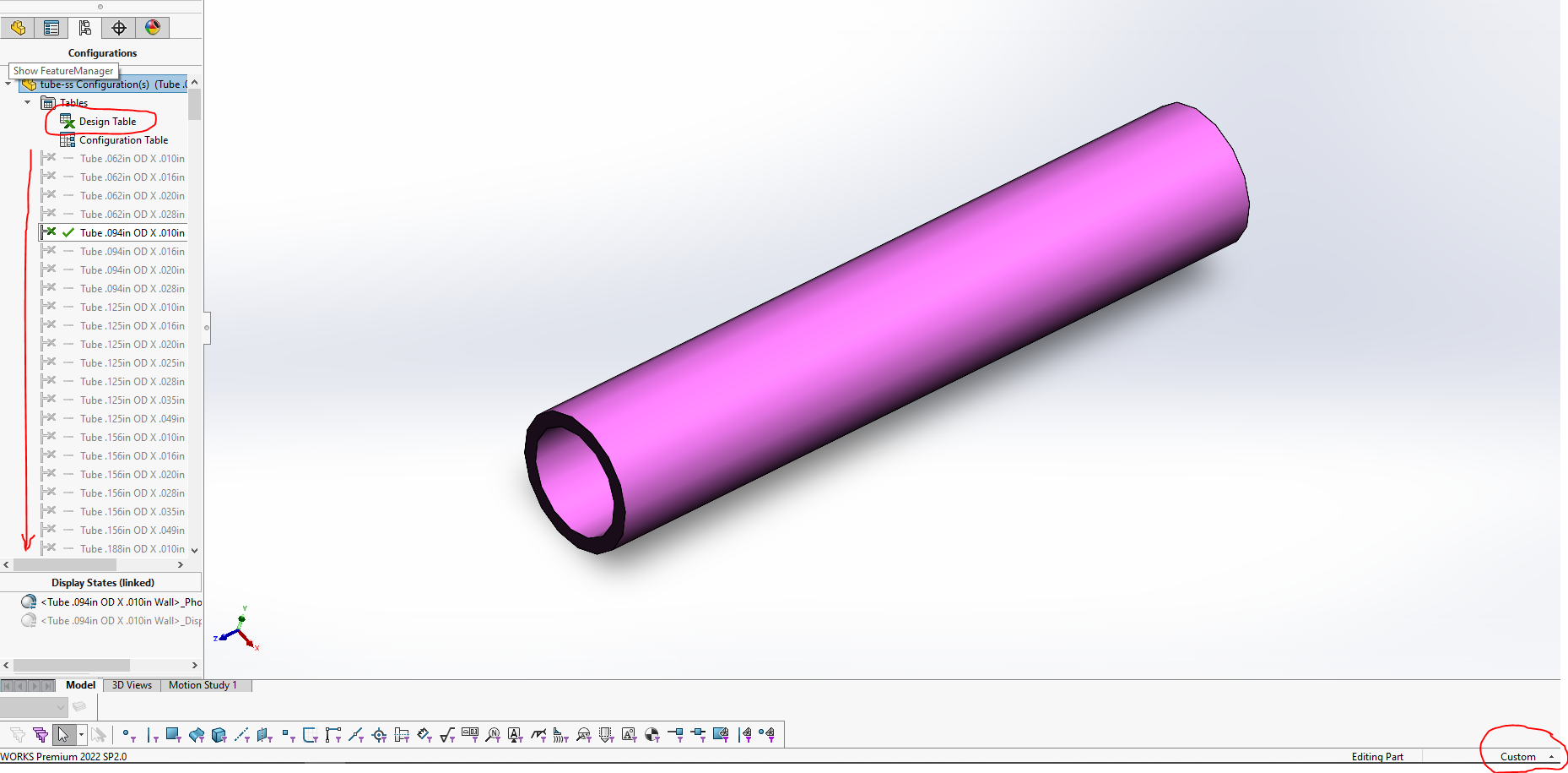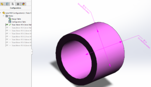 Geometrin är en enkel slangstump. Tittar vi närmare så ser vi att det finns en mängd konfigurationer av denna stump, dvs många olika dimensioner i samma part. Dessa konfigurationer är skapade och styrda från en Excel-fil i en så kallad Design Table. Designtabeller är väldigt kraftfullt för att snabbt och enkelt skapa varianter inom en part men betänk att det också gör parten prestandamässigt tyngre så ha ett gott omdöme i hur många varianter som egentligen krävs.
