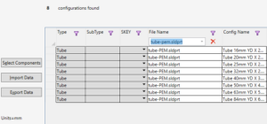 Byt flik till Piping and Tubing Database, klicka på Import Data, Synchronize (obs kan ta väsentlig tid). RLM letar nu igenom hela filstrukturen under (*) efter nya konfigurationer. Den skall finna dina 8st nya slangstorlekar. Verifiera genom att exempelvis filtrera enligt bilden nedan.