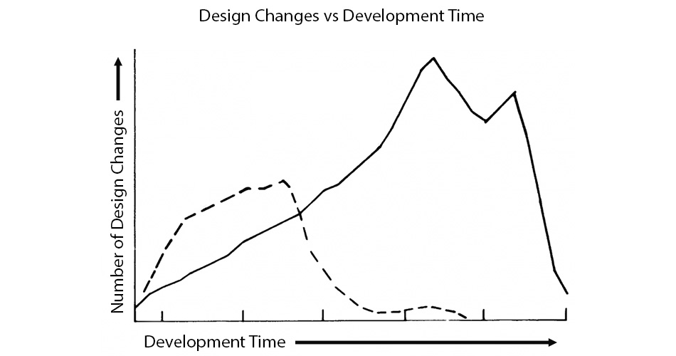 Självklart har alla design-problem sina vägar till lösning, men det finns något gemensamt för alla lösningar som ofta glöms bort. Ju längre tiden går från projektstart desto dyrare blir det att göra en eller flera förändringar i resurstimmar, tillverkningskostnader och marknadsandelar.