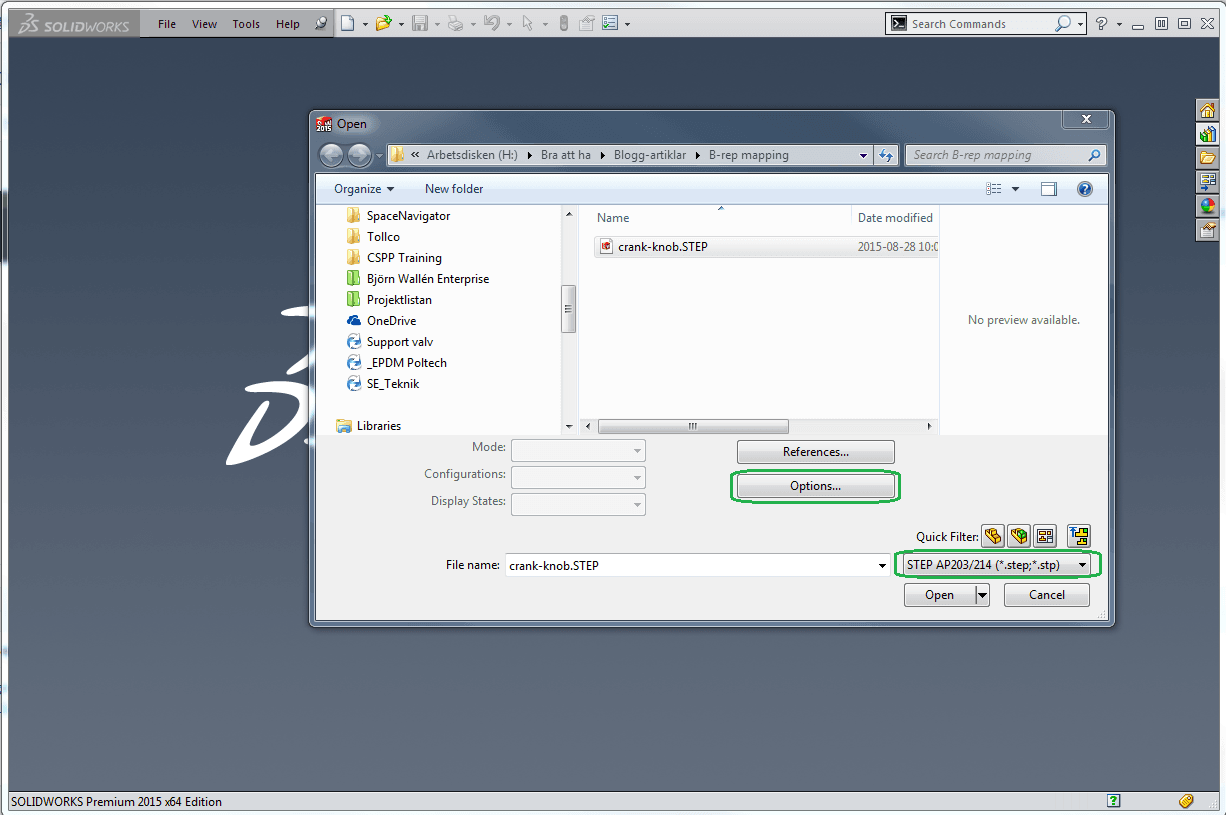 För att öppna din step-fil börjar du med att trycka open i SolidWorks. Se till att välja filformatet step och tryck sedan på knappen options.