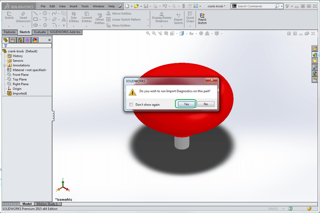 Tryck sedan open för att öppna din step-fil. När filen öppnats i SolidWorks dyker en fråga upp om du vill köra import diagnostics. Det är alltid rekomenderat att göra detta. Särskillt om det är fil som ska användas till något, t ex ingå i en sammanställning eller dylikt. Trasiga importerade filer är en källa till instabilitet och dålig prestanda. Import diagnostics hjälper oss att handskas med detta.