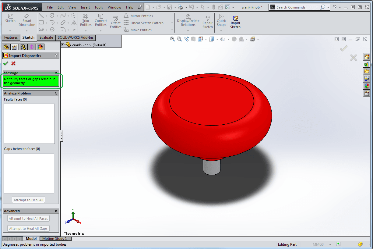 När import diagnostics-kommandot startat får du information om SolidWorks tycker att din importerade fil är hel och fin eller inte. Här finns också möjligheten att be SolidWorks laga filen efter bästa förmåga.