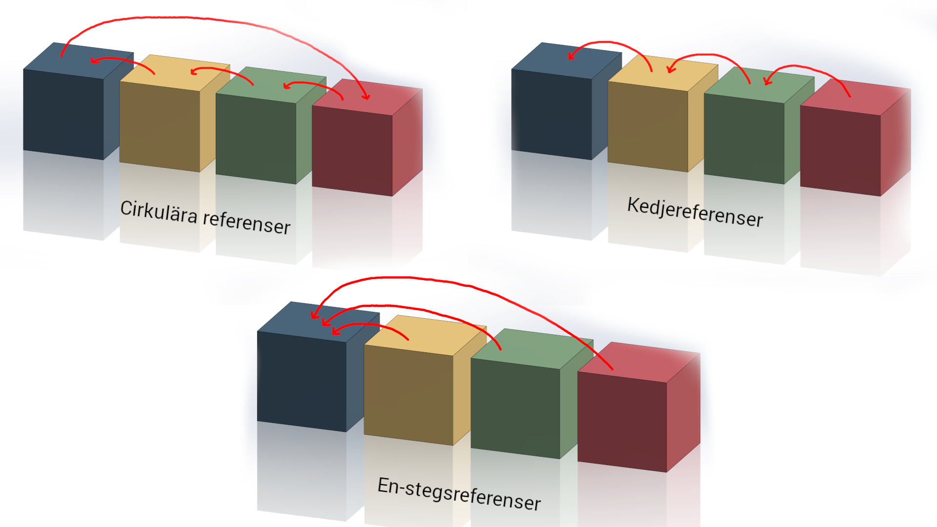 Nedan visas tre alternativ på hur dessa klossar kan referera till varandra. Alla tre metoder använder sig av mate-typerna coincident och distance, men på olika sätt. Cirkulära referenser bör undvikas till högsta grad för att underlätta för programmet. Även kedjereferenser gör det onödigt krångligt. Här behöver programmet ta reda på vart den blåa, gula och gröna klossen befinner sig, innan positionen för den röda kan tas fram. I det tredje exemplet används en-stegsreferenser. Här är den blåa klossen fixerad och alla andra klossar refererar till denna. Detta är en metod att föredra för att minska tiden för återskapande av modellen.