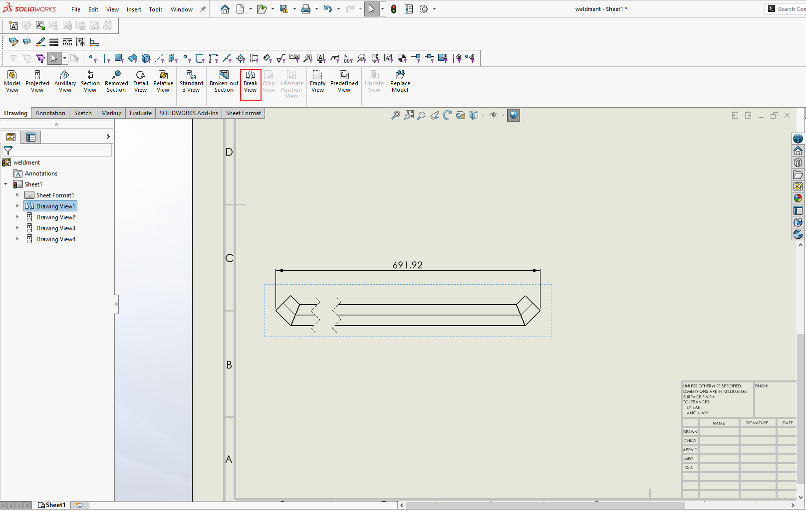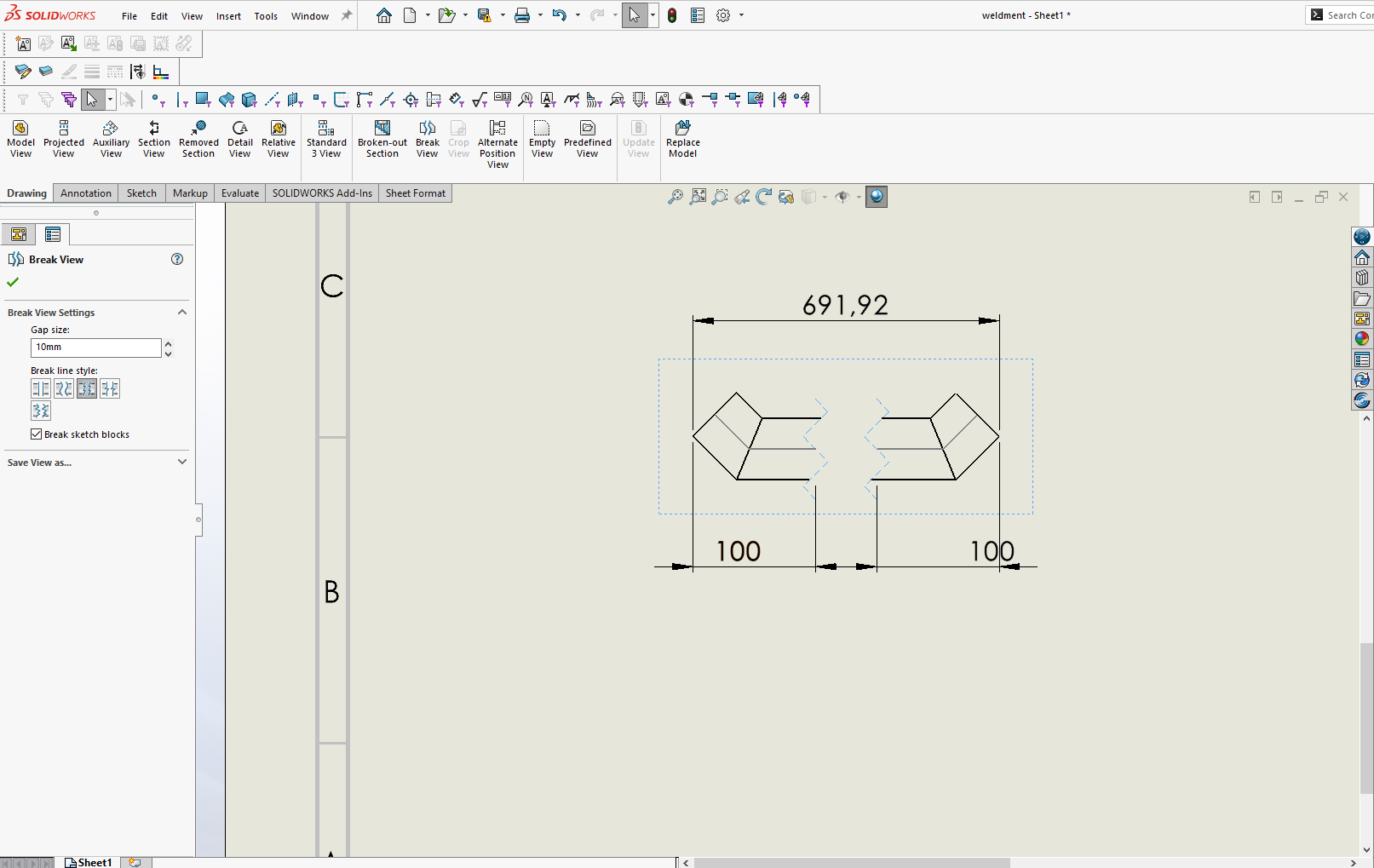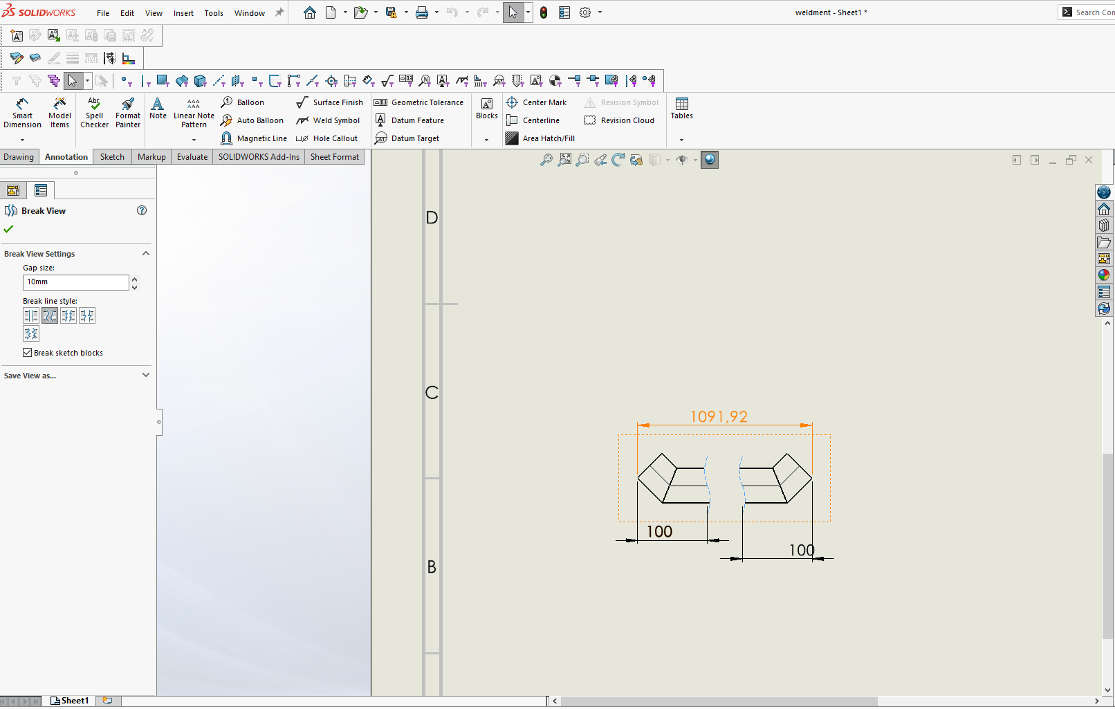 3. Välj en av brytlinjerna och välj sedan den delen av geometrin du vill måttsätta från och skriv in måttets värde