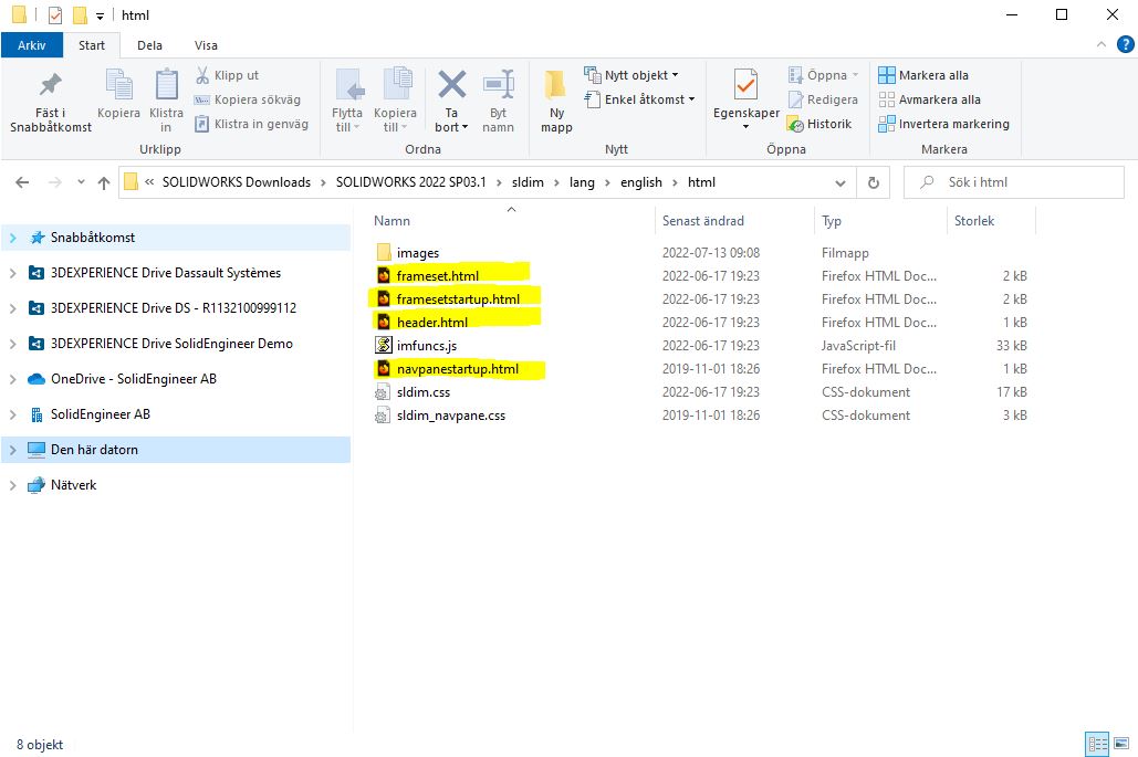 Problemet uppstår då det finns filer i mappen som är blockerade för användning. Närmare bestämt så finns det fyra stycken html-filer som behöver avblockeras. Du hittar dem under ….SOLIDWORKS 20XX SPX.X\sldim\lang\english\html