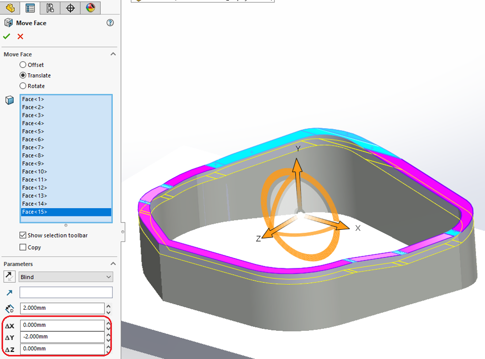 Markera sedan alla ytor som ska flyttas, skriv sedan in hur mycket ytorna ska flyttas i y-led, sätt ett minustecken om den ska flyttas ner (-2 mm i detta exempel).