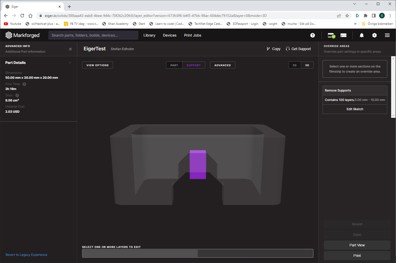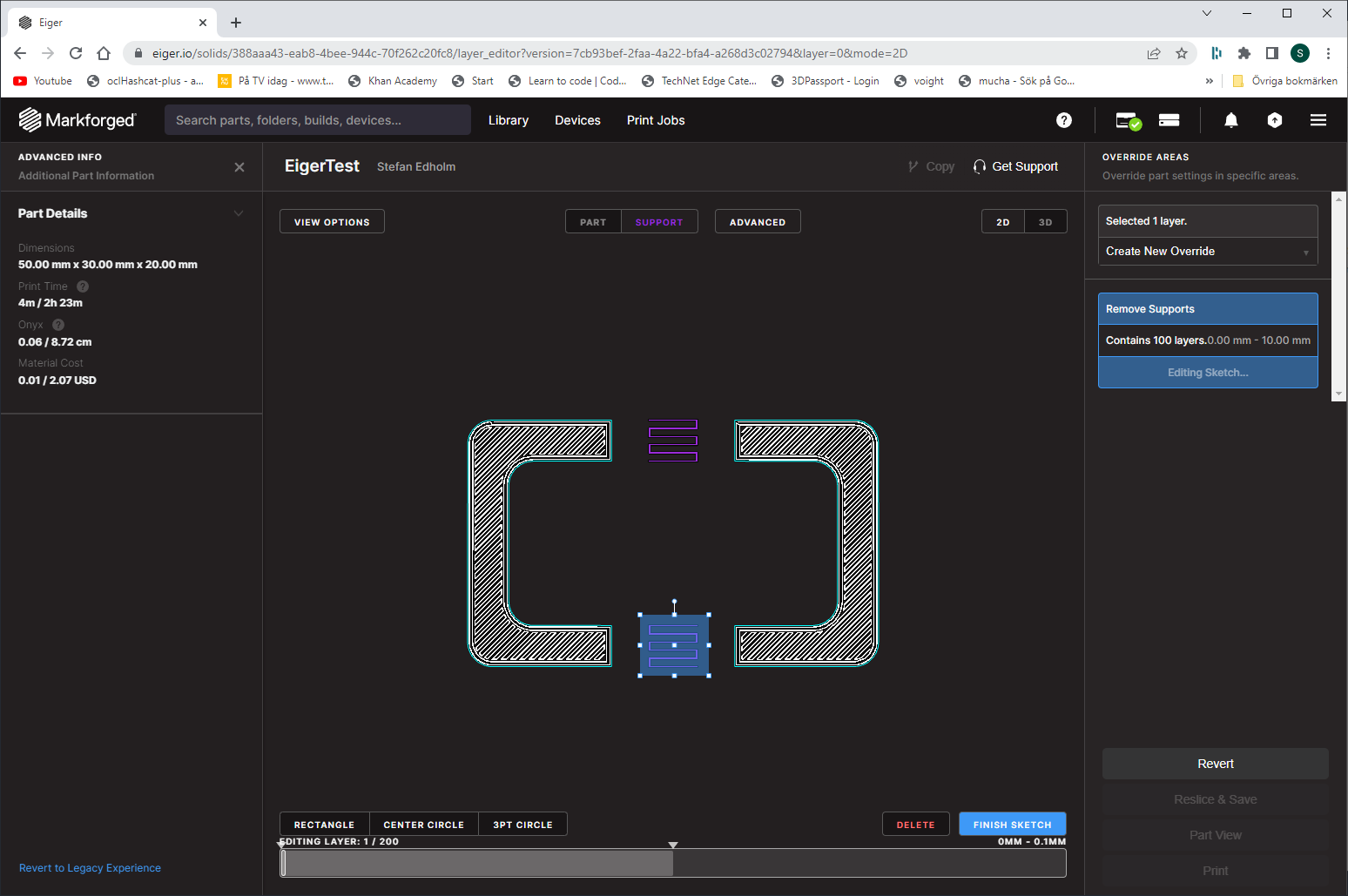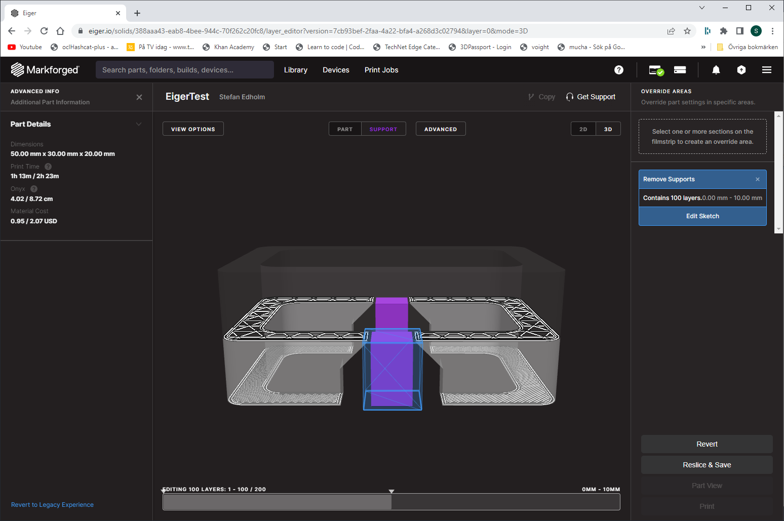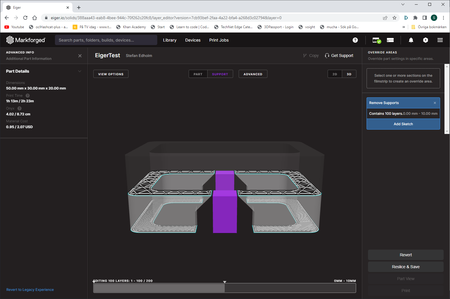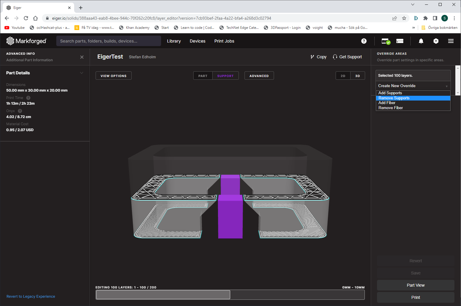 Väl där så finns det två möjligheter att, i detta fall, välja vilka lager jag vill göra ”override” på. I bilden så har jag markerat lager 1-100. Detta gör man genom att längst ner markera lagren genom att hålla ner vänster musknapp och och dra. Det går att finjustera lagren efteråt. När man markerat lagren så klickar man på ”Create New Override” och väljer vad man vill göra, i detta fall ”Remove Supports”.