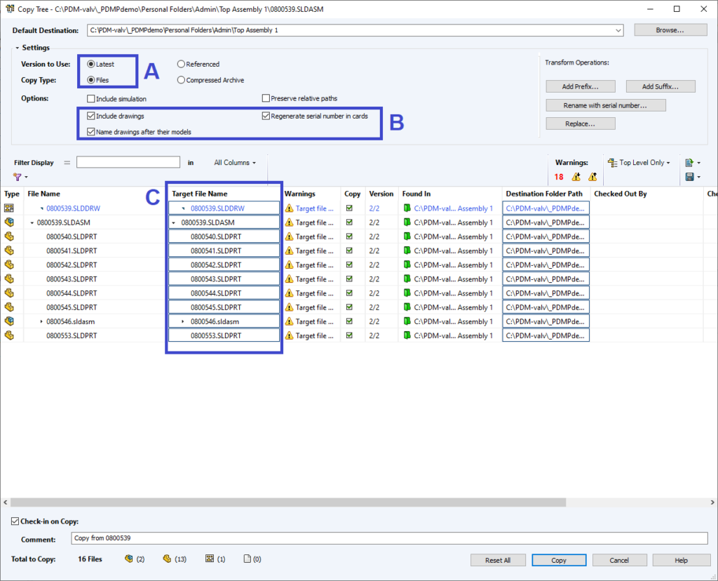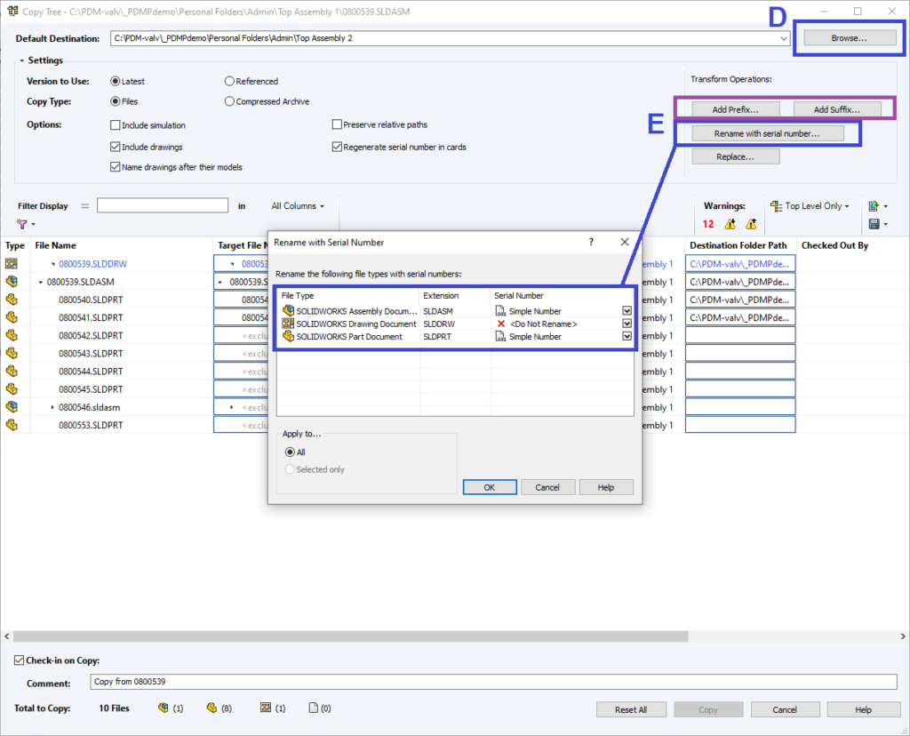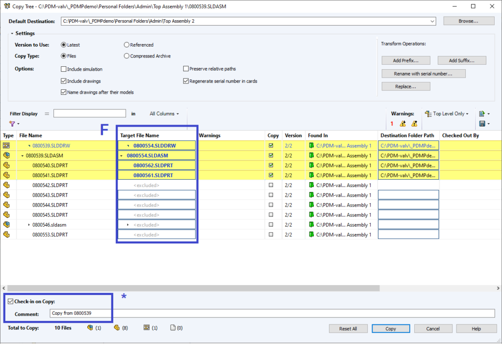 E – Döp om filerna. I PDM Professional har vi möjlighet att döpa om filerna från en nummersnurra om en sådan finns på plats. Notera att vi ställer om ritningar till <Do Not Rename> eftersom de ändå ska heta samma som sina modeller. På så sätt att stega upp nummersnurran i onödan.