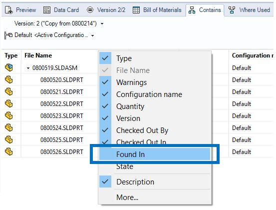 Innan man gör det kan det vara bra att se till att ha kolumnen Found In framme, genom att högerklicka på någon av kolumnnamnen: